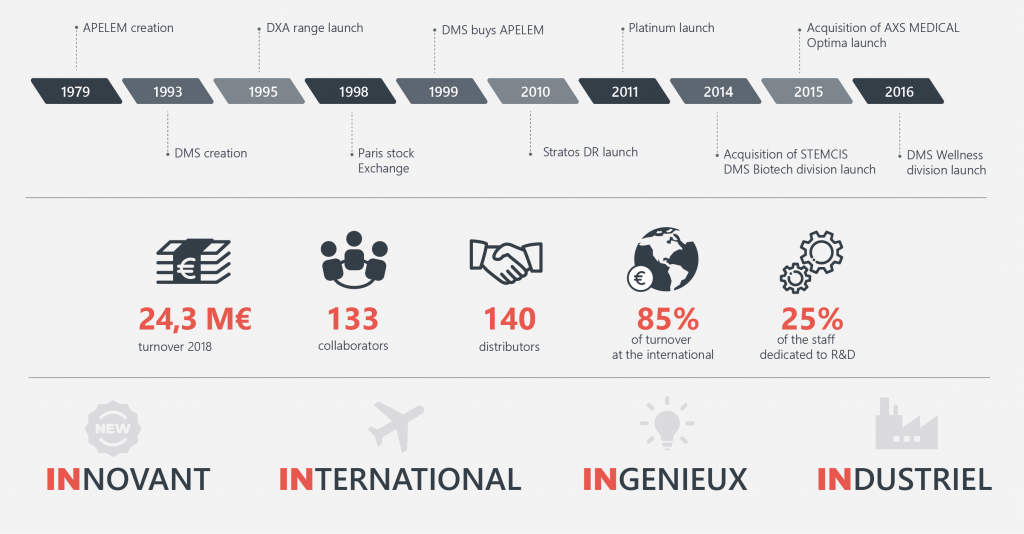 DMS Imaging is a French high-tech company based in the south of France specialized in medical imaging diagnostics. With more than 30 years of experience, the brands that make up DMS Imaging: Apelem, DMS, AXS Medical and Medilink offer a complete range of innovative solutions in radiology, bone densitometry, stereo-radiography and posturology, all of which are adapted to the demands of the global marketplace. Our network of over 120 distributors in over 140 countries all across the globe as well as subsidiaries and joint-ventures, contribute to the international dimension of the quality of our products. DMS Imaging generates 85% of our turnover through the exportation market.